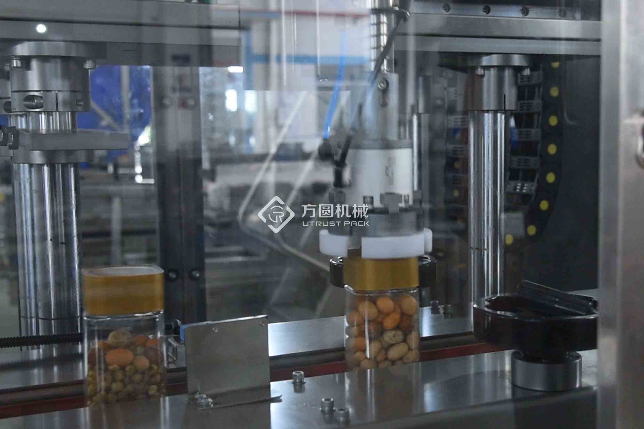 Farewell to the feeder, I sat in the jar and arrived at our second stop - the site of the follow-up capping machine.As can be seen from the front, the square lid was carefully grabbing the lid and completing place by the staff. In the nest second, the 3-axis servo robotic arm acted like precise "big hand", steadily grabbing the lid and completing  the tightening action. What's even more impressive is that the robotic arm can also achieve real-time torque feedback, ensuring that each can lid is tightened appropriately, without loosening or leaking air, and without being too tight to open.A stable output speed of 50 bottles per minute is achieved, and there is no need to panic in case of changing the can type.With just one click, the device can be adjusted to adapt to the "height,height,weight,and thinness" of different cans. the switch can be quickly completed in 3 minutes, and the efficiency can be directly maximized.